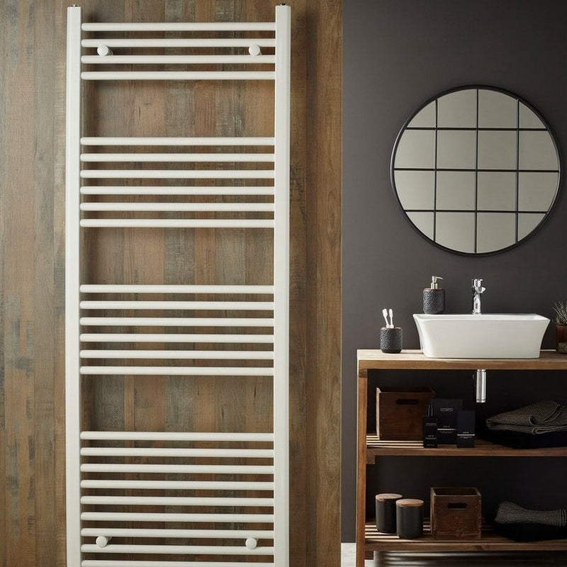 The Redroom Elan Straight White Towel Warming Radiator offers both functionality and style, seamlessly integrating into any bathroom décor while keeping your towels warm and inviting.