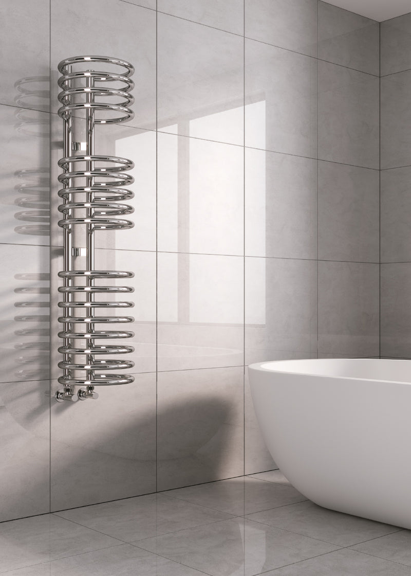 Introducing the Claro Chrome Mild Steel Designer Radiator from Reina with its genuinely unique circular design, an eye-catcher within any bathroom or cloakroom whilst having excellent functionality when hanging and drying towels and being able to fit into any tight-spaced bathroom or cloakroom.
